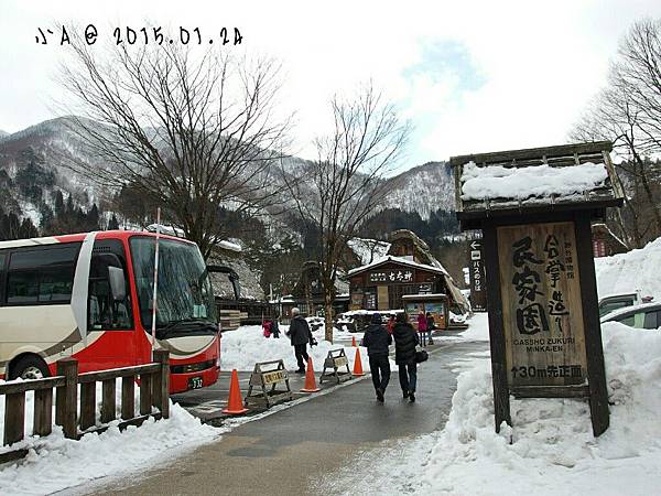 下圖則是白川鄉合掌村的巴士停放處(せせらぎ駐車場),是在還沒過相逢橋前(此為舊資訊,2016.10.01 已搬遷至白川鄉バスターミナル ,請看下面更新敘述)。附近有一棟觀光案內所,另一邊則是合掌造民家園,這邊只有停放高速巴士,而若是想要搭乘巴士前往城山展望台,則是在過了相逢橋之後進入萩町的某個停車場,不是在這裡喔!